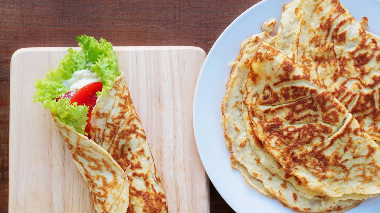 Em 20 minutos faça panqueca low carb com ovos, creme de leite e queijo. Recheie com frango desfiado e temperos. Rica em proteínas, ela sacia a fome e pode ser congelada para facilitar a dieta na semana.
