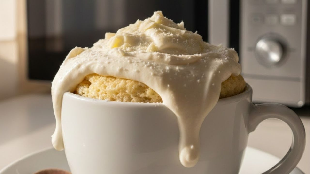 O bolo de leite em pó no micro-ondas fica pronto em cerca de 3 minutos porque o aquecimento direto da água gera vapor, ativa o fermento e coagula proteínas. Proporções corretas garantem expansão, umidade e estrutura estável.