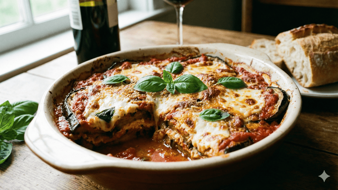 Ao sair do forno, é importante deixar a lasanha de berinjela descansar alguns minutos antes de cortar. Esse tempo ajuda as camadas a ficarem mais firmes, deixando os pedaços mais bonitos no prato e evitando que tudo desmonte.