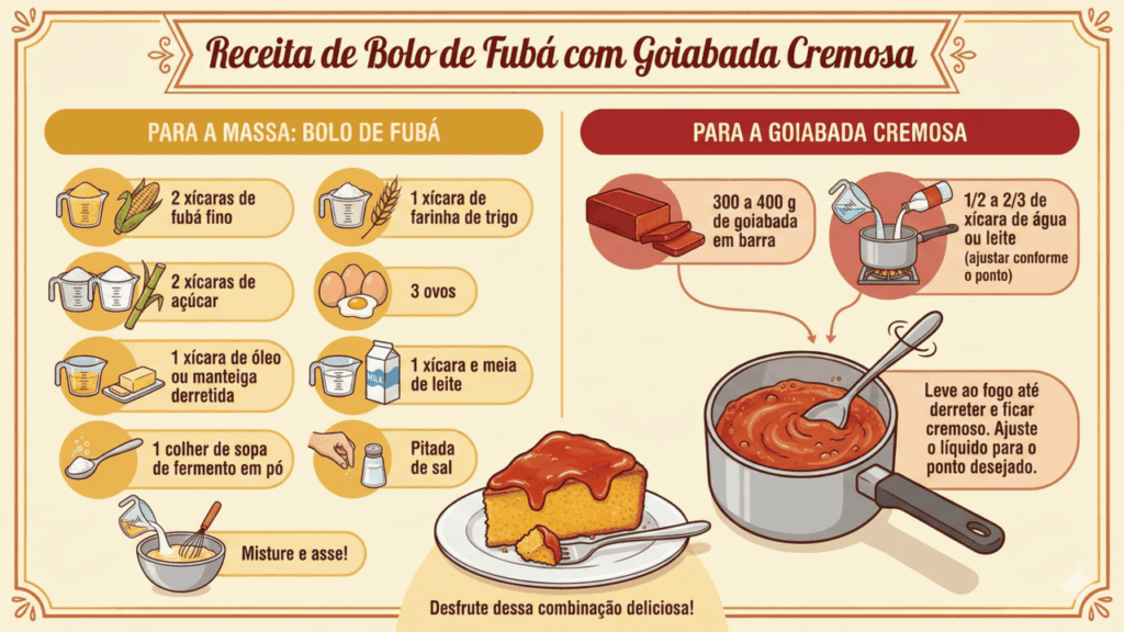 Para organizar o preparo do bolo de fubá com goiabada cremosa, é fácil dividir tudo em duas partes: massa e recheio. Os ingredientes a seguir são uma base simples de versão caseira, que você pode adaptar ao seu gosto, deixando o bolo mais leve ou mais rico.