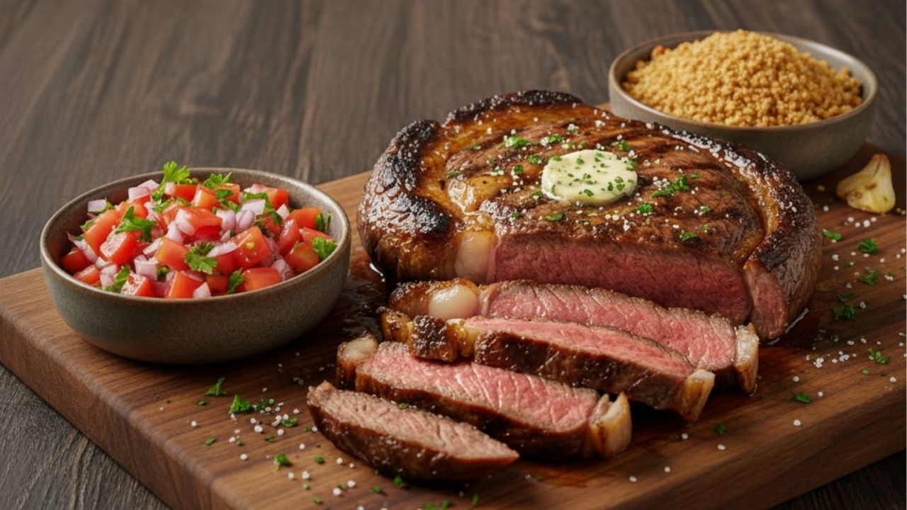 O contra filé é um corte naturalmente macio e com gordura bem distribuída, o que favorece o preparo em calor seco e intenso. A escolha de temperos simples não é casual, pois preserva o sabor original da carne e permite que a reação de Maillard aconteça de forma eficiente.