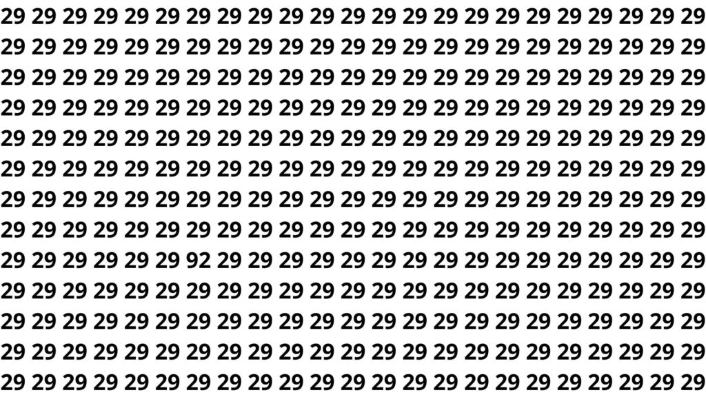 O desafio é simples de explicar, mas exigente na prática: a imagem mostra uma sequência cheia de número 29, repetidos linha após linha, quase como um padrão hipnótico. Em algum ponto dessa grade visual, o número 92 está discretamente posicionado, pronto para confundir o olhar menos atento e testar sua rapidez.