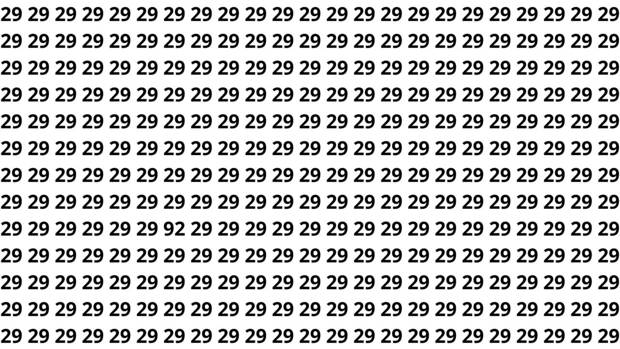 O desafio é simples de explicar, mas exigente na prática: a imagem mostra uma sequência cheia de número 29, repetidos linha após linha, quase como um padrão hipnótico. Em algum ponto dessa grade visual, o número 92 está discretamente posicionado, pronto para confundir o olhar menos atento e testar sua rapidez.