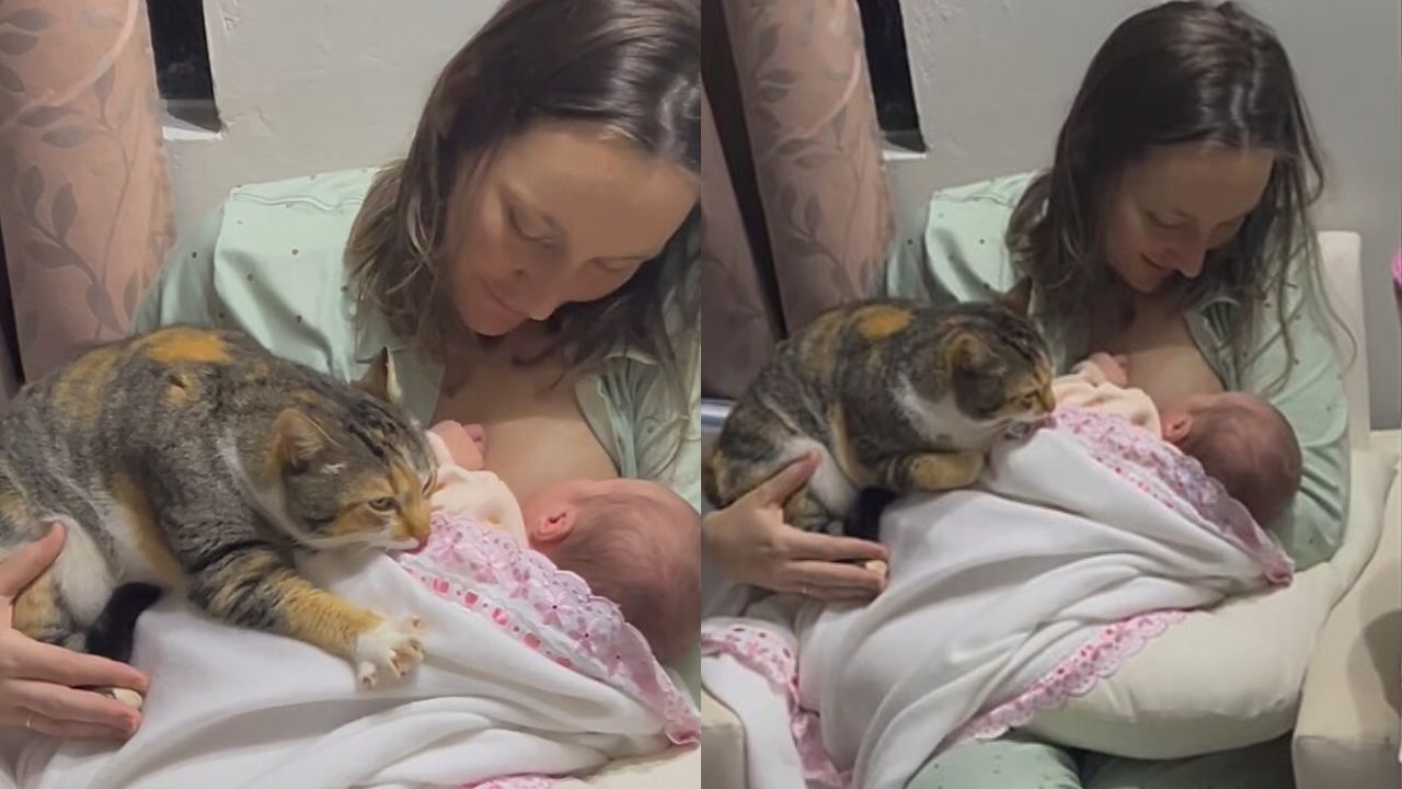 Quando o bebê chegou em casa, os pais notaram algo especial. O gato da família se aproximou com delicadeza e começou a “amassar pãozinho” sobre o cobertor, gesto que demonstra conforto, segurança e afeto profundo.