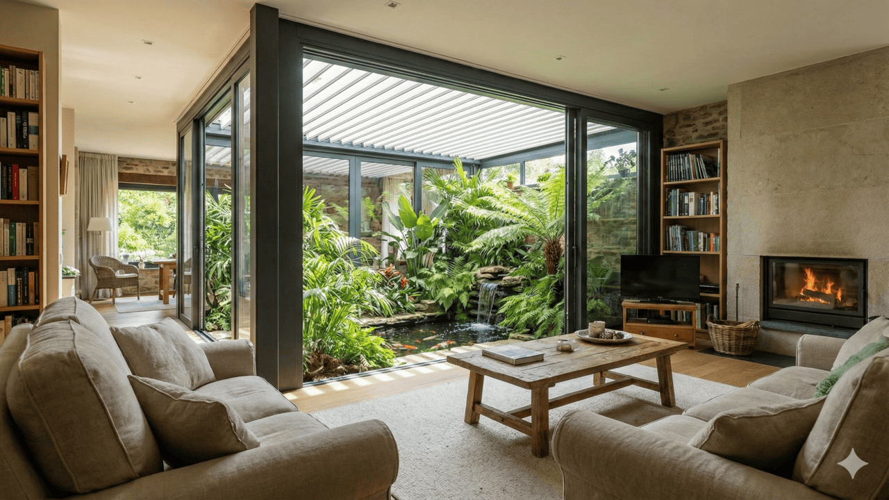 O jardim de inverno na sala é um espaço interno dedicado às plantas, geralmente perto de janelas, portas de vidro ou claraboias, aproveitando ao máximo a luz natural. Ele surgiu como solução para regiões frias, onde o cultivo externo era limitado, mas hoje é usado em qualquer clima, inclusive no Brasil, pela beleza e sensação de bem-estar que proporciona.