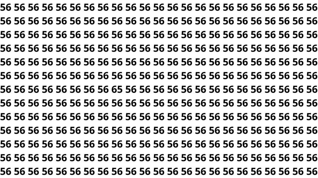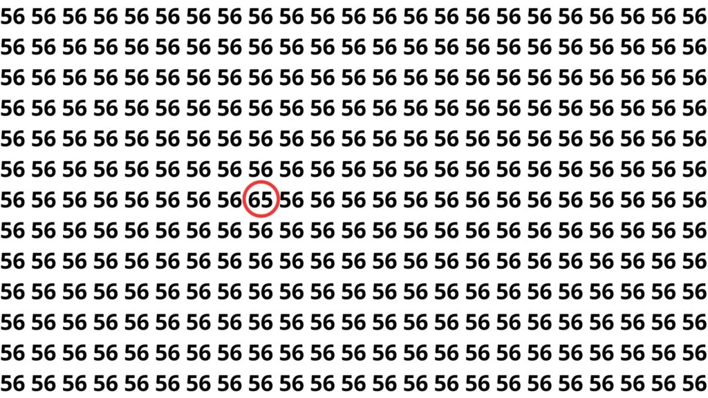No desafio em que a pessoa precisa encontrar o número 65 entre vários 56, o número escondido está posicionado em uma das linhas centrais da imagem, levemente deslocado em relação ao padrão visual que se repete. A proximidade entre os caracteres faz com que muitos confundam o “5” e o “6” finais e leiam tudo como se fosse 56, reforçando o hábito do cérebro de completar padrões conhecidos.