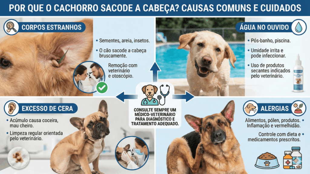 Além das infecções, existem outras situações bem frequentes no dia a dia que podem explicar o cachorro balançando a cabeça com insistência, variando de algo simples até casos que exigem tratamento mais cuidadoso.