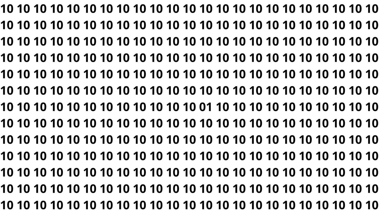 No desafio apresentado, o número escondido na ilusão de ótica era o 01 camuflado entre dezenas de 10 alinhados. A dificuldade principal está em que 01 e 10 usam os mesmos algarismos, o que engana o olhar, especialmente quando o 01 aparece em uma posição intermediária, onde a atenção já está cansada.