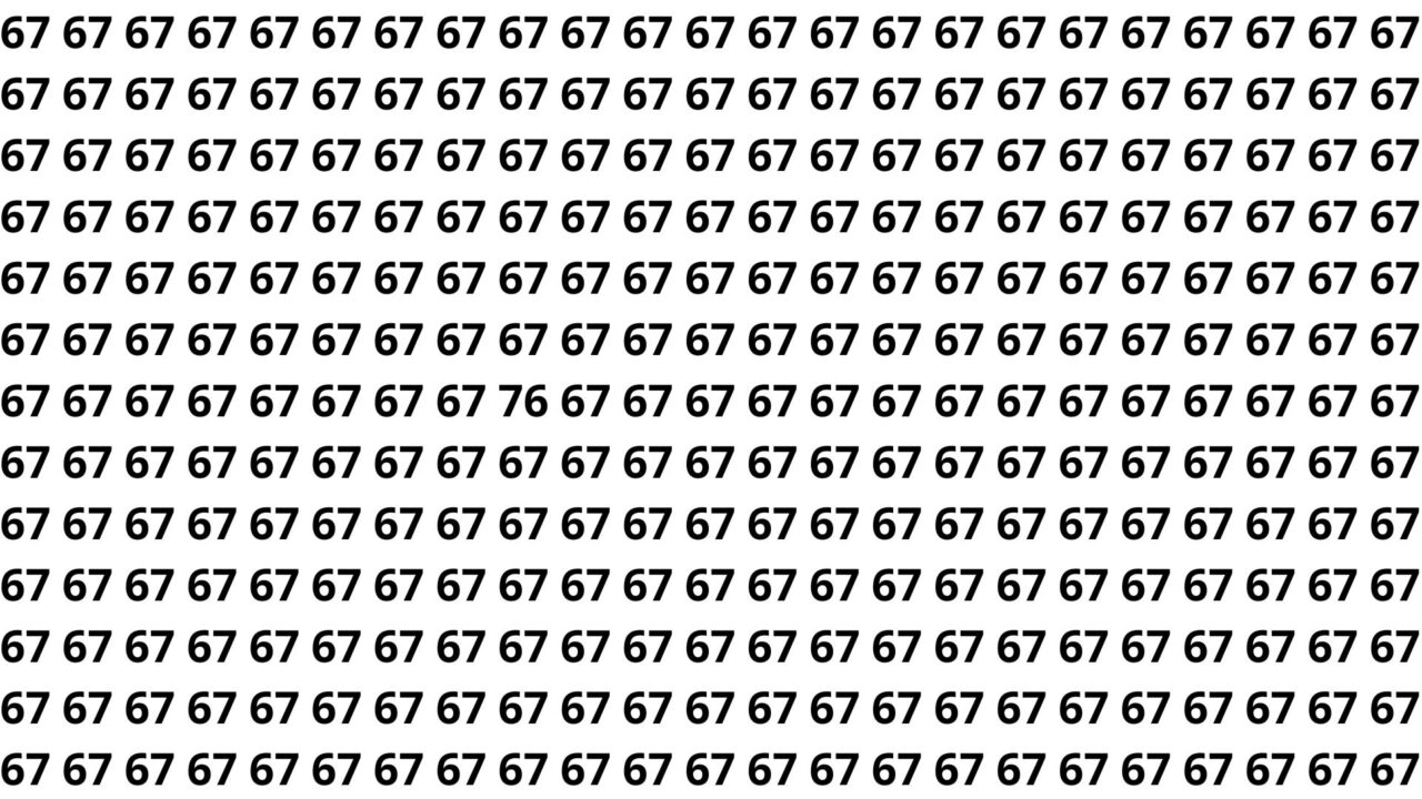 Neste desafio, uma grade repleta de números 67 esconde discretamente um único 76. À primeira vista, tudo parece uniforme, mas entre linhas e colunas um dígito troca de posição e muda completamente o resultado, exigindo rapidez na identificação visual.