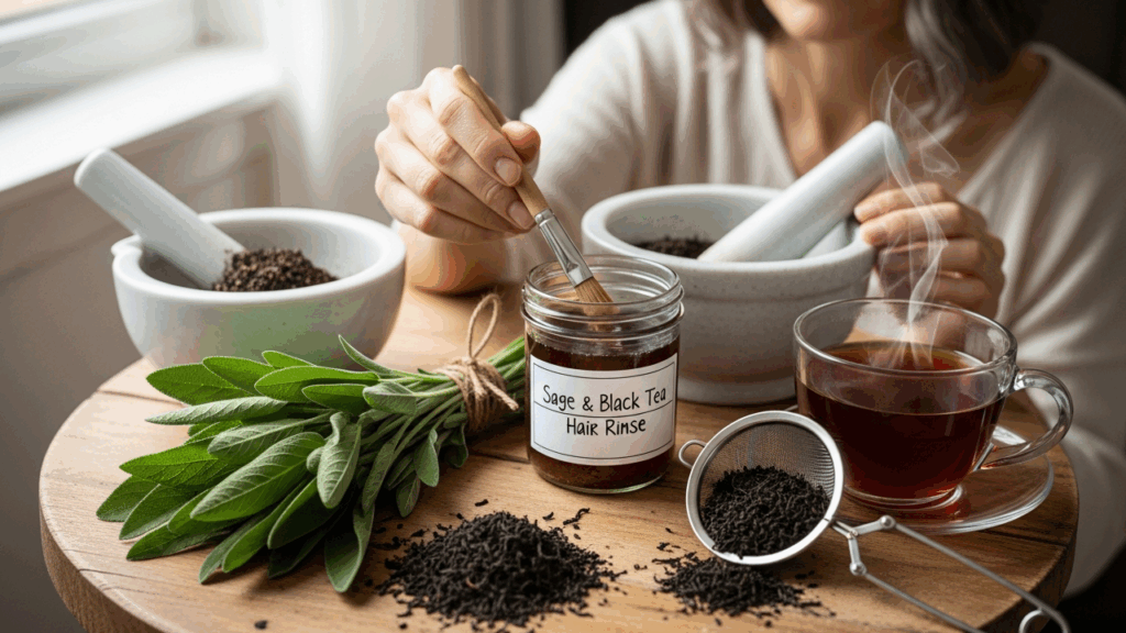 Misturinha caseira com sálvia e chá-preto surge como alternativa sem química para camuflar fios brancos de forma gradual, sem agressões ao couro cabeludo e com baixo custo.