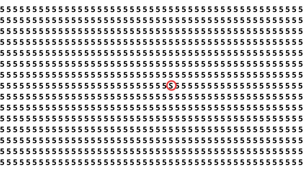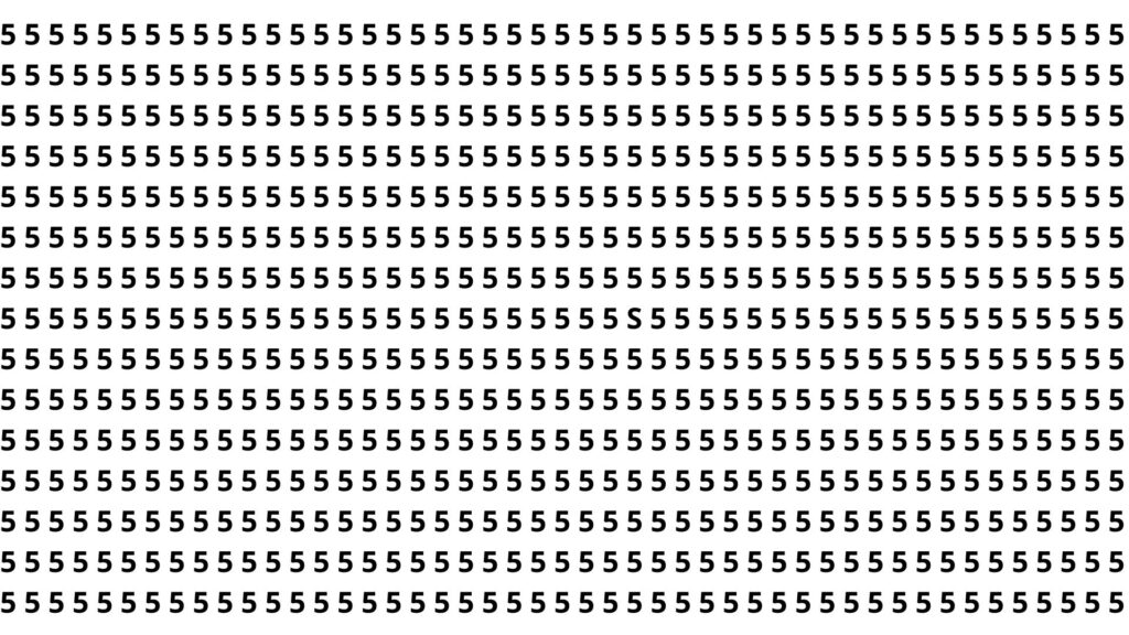 O desafio aqui é direto: em uma imagem cheia de números 5 alinhados, há uma única letra escondida, camuflada entre os dígitos. A missão é encontrar a letra S entre vários 5 em apenas 5 segundos, sem pausar, sem ampliar e sem pedir ajuda de terceiros, o que torna tudo mais emocionante.