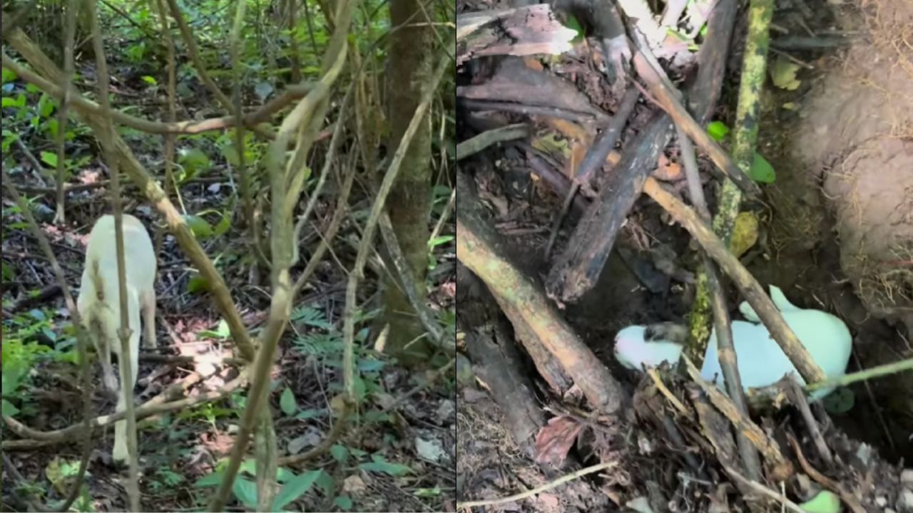 Com calma, Rick conseguiu alcançá-lo e realizar o resgate, retirando o animal daquele esconderijo improvisado. Minutos depois, a cadela voltou a se deslocar pela mata, emitindo sinais que aparentavam um convite para ser seguida outra vez, até que o casal encontrou outro filhote entre a vegetação, reforçando a suspeita de uma ninhada escondida.