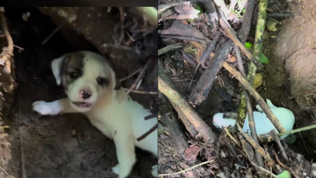 Após caminhar por um bom tempo, a cadela parou em frente a um buraco coberto por troncos e galhos, semelhante a um abrigo improvisado. Ali, abrigado e assustado, estava um filhote de cachorro, que latia e tentava se esconder ainda mais entre os pedaços de madeira, claramente com medo e sem saber a quem recorrer.