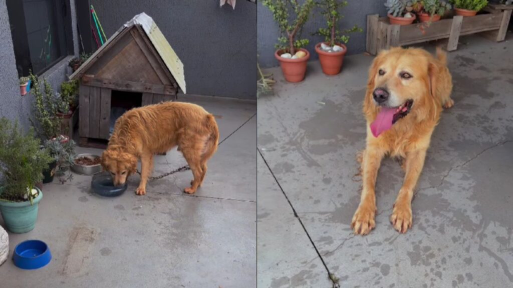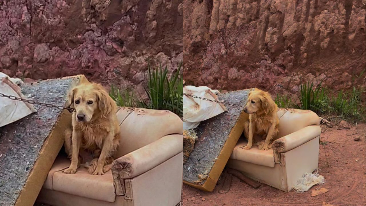 Em um terreno baldio, cercado por entulho e terra vermelha, um cão de grande porte estava sentado sobre um sofá velho e rasgado. Preso por uma corrente pesada, o animal demonstrava cansaço extremo e um olhar marcado por tristeza. A imagem deixava claro que aquele abandono não era recente. O local improvisado parecia ser seu único abrigo, exposto ao sol, à chuva e ao descaso.