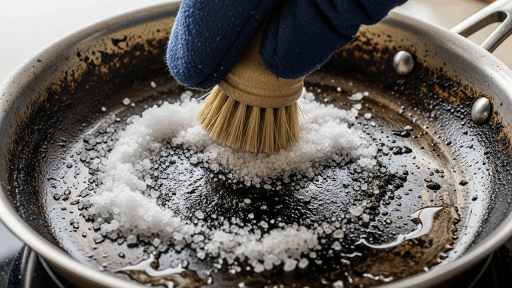 O sal de cozinha possui ação abrasiva natural, capaz de soltar resíduos grudados sem riscar superfícies metálicas quando usado corretamente. Além disso, ele absorve gordura e umidade, facilitando a remoção da sujeira aderida ao fundo da frigideira.