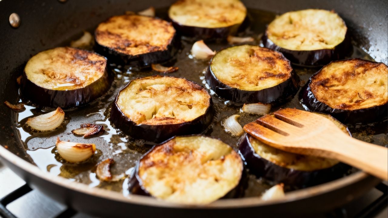 A berinjela pode absorver gordura com facilidade, então a quantidade de óleo precisa ser controlada desde o início. Uma frigideira bem quente, fogo ajustado e o hábito de selar sem ficar virando a peça toda hora fazem o azeite render mais e o resultado ficar mais seco.