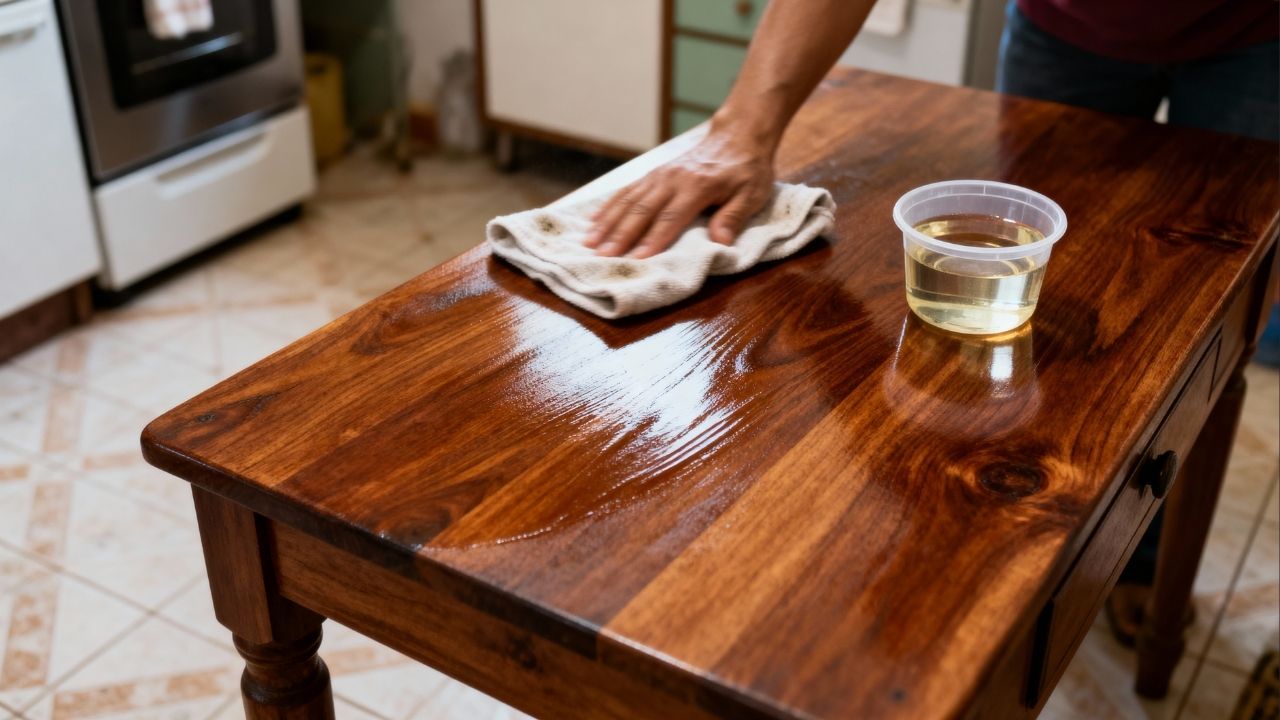 A aplicação deve ser leve e cuidadosa, evitando encharcar o móvel. O objetivo é limpar e proteger a superfície, não saturar a madeira com líquido.