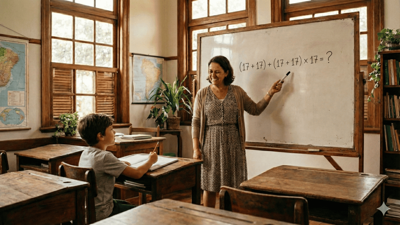 A expressão (17 + 17) + (17 + 17) x 17 costuma causar dúvidas porque muitos fazem todas as somas primeiro e só depois pensam na multiplicação. Seguindo a hierarquia, o primeiro movimento é lidar com os parênteses, sem mexer ainda na parte em que aparece o “x 17”, evitando somar tudo de uma vez de forma automática.
