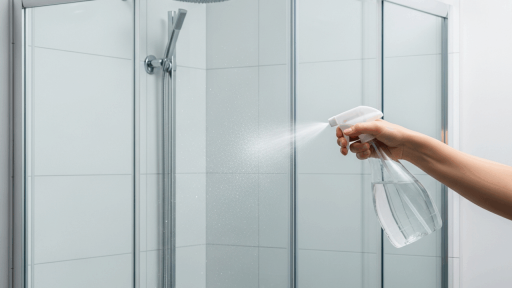 O ideal é borrifar o vinagre diluído no vidro logo após o banho, enquanto ainda estiver úmido. Isso potencializa o efeito preventivo contra manchas.