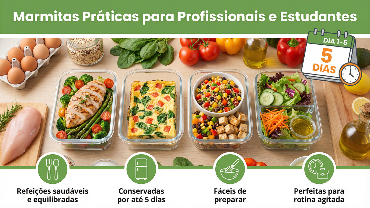 A tabela a seguir apresenta três opções de marmitas práticas: frango com legumes assados, omelete de forno com espinafre e queijo e quinoa com grão-de-bico e temperos aromáticos. Cada prato foi selecionado para oferecer sabor, nutrientes e durabilidade, facilitando o planejamento das refeições e garantindo praticidade sem abrir mão da qualidade.