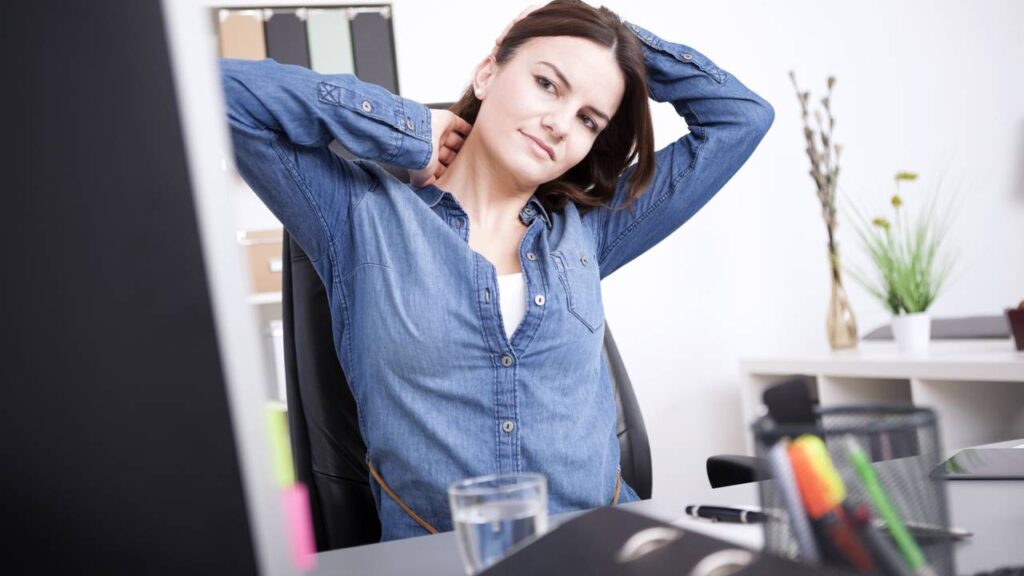 Passar horas sentado aumenta dores e tensão muscular Alongamentos rápidos ajudam a melhorar postura e circulação.