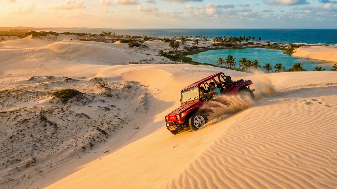 Genipabu oferece uma paisagem exótica que lembra desertos africanos, mas a apenas meia hora da capital potiguar. A combinação de aventura e contemplação – do voo do buggy ao silêncio do pôr do sol – faz do lugar um destino completo para diferentes perfis de viajante.