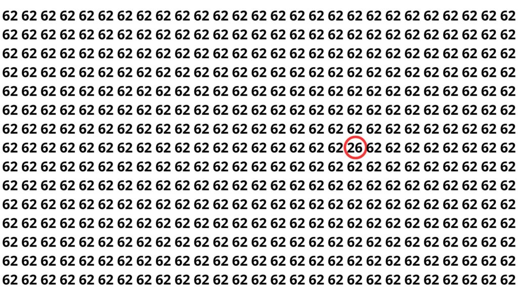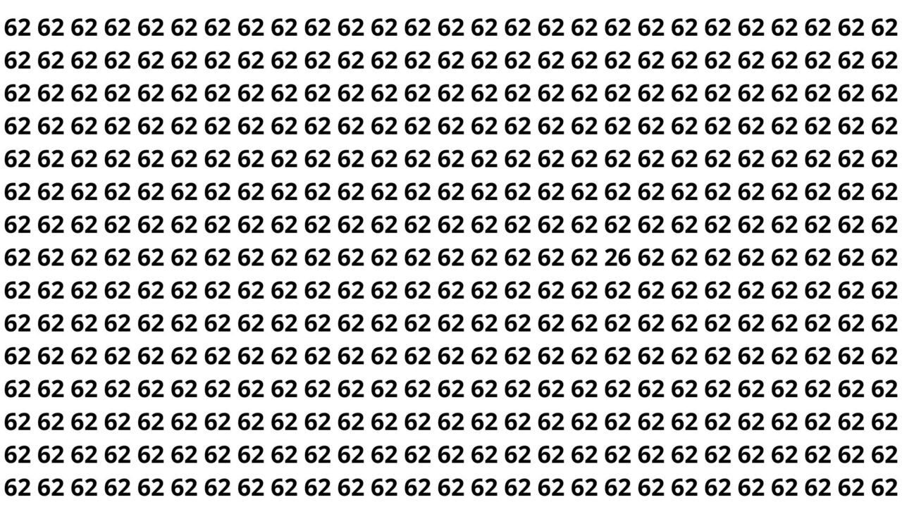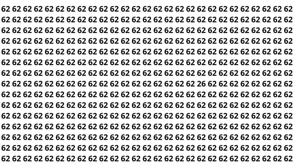 No desafio de encontrar o número 26 entre vários 62, a resposta correta é mesmo o 26, escondido de forma estratégica para se misturar à repetição dos outros números. Geralmente, ele aparece com tamanho, cor e alinhamento quase idênticos, fazendo o olhar simplesmente deslizar por cima sem perceber.