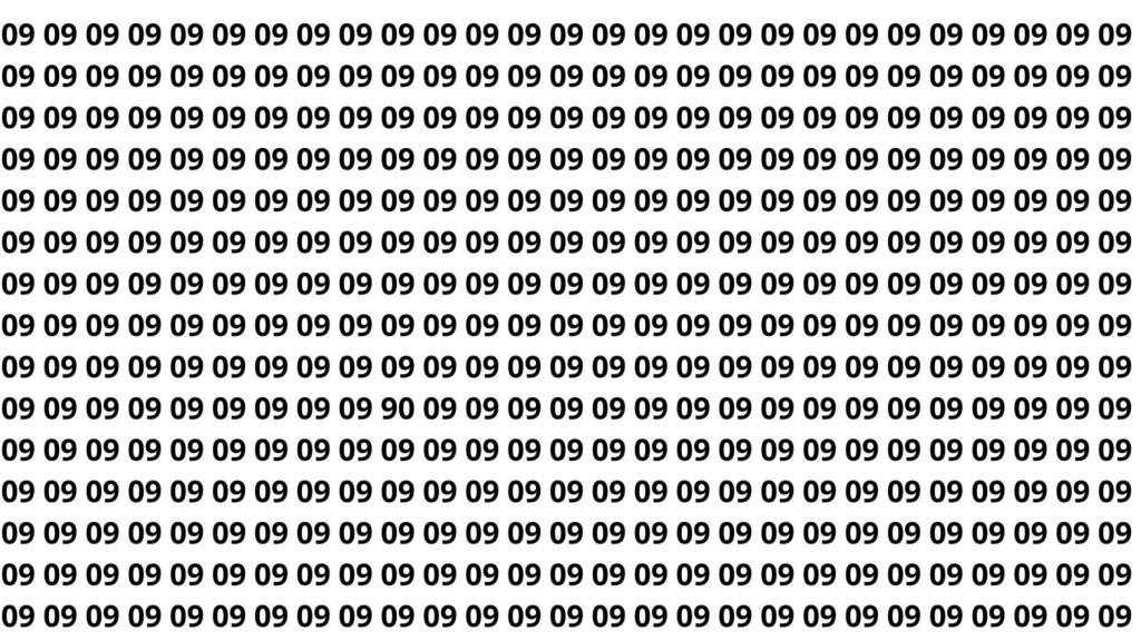 Neste desafio, a imagem exibe dezenas de combinações “09” alinhadas em blocos, linhas e colunas. Em algum ponto da ilustração, está camuflado o número 90, visualmente muito parecido com os demais elementos ao redor.