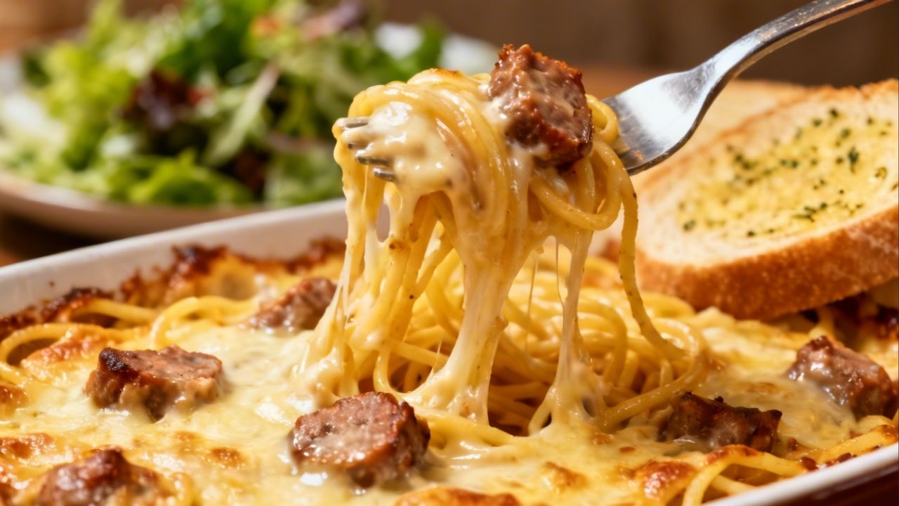 A textura do espaguete gratinado fica mais cremosa por dentro e levemente crocante por cima, criando contraste irresistível.