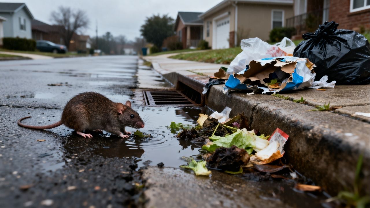 Durante períodos de chuva intensa, a rede de esgoto urbana pode sofrer sobrecarga. Com isso, os roedores procuram saídas alternativas, alcançando bueiros, quintais e áreas próximas às residências em busca de segurança e alimento.