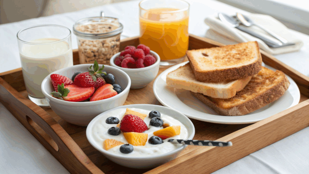 Café da manhã leve em casa: frutas, iogurte, torradas e líquidos ajudam quem não tem fome a manter energia e foco logo cedo.