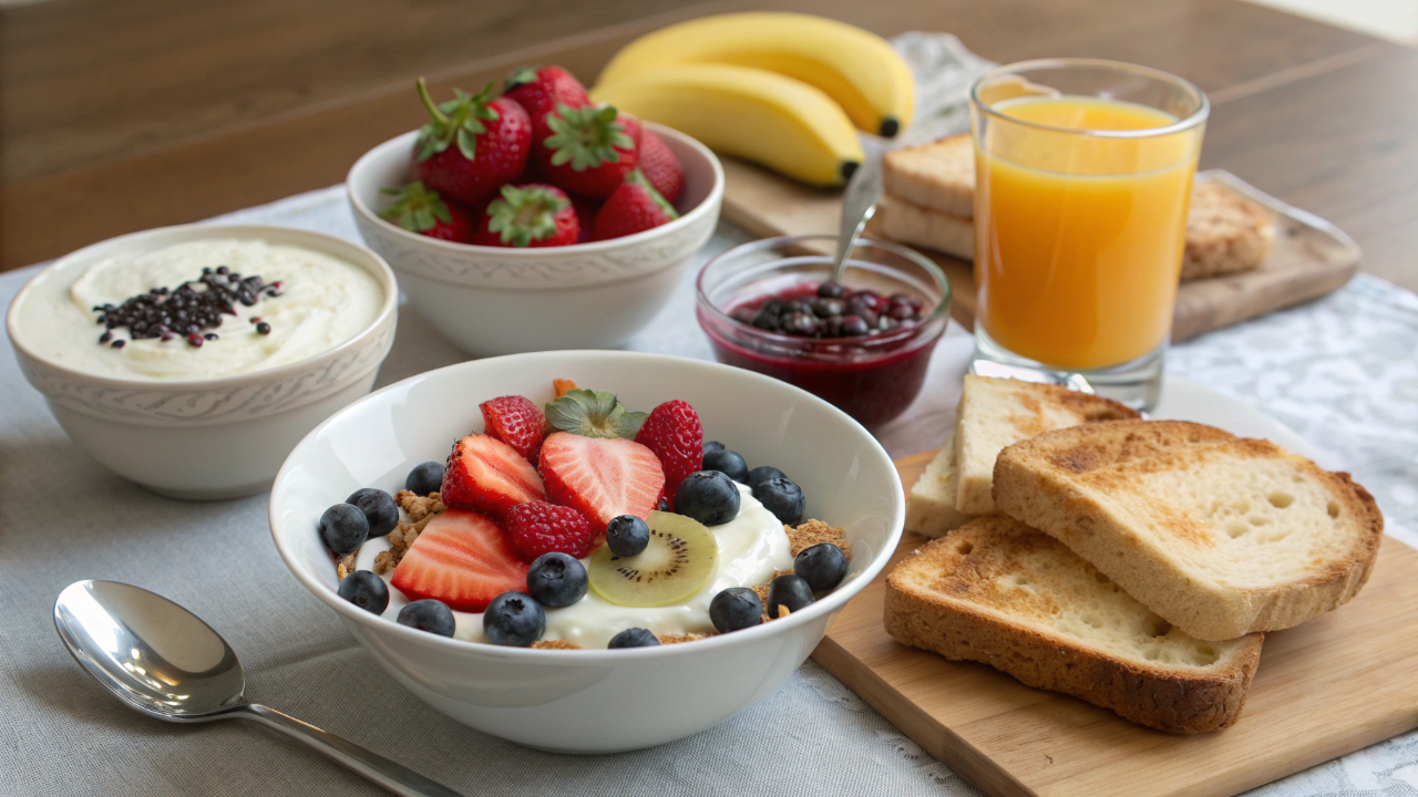 Café da manhã leve em casa: frutas, iogurte, torradas e líquidos ajudam quem não tem fome a manter energia e foco logo cedo.