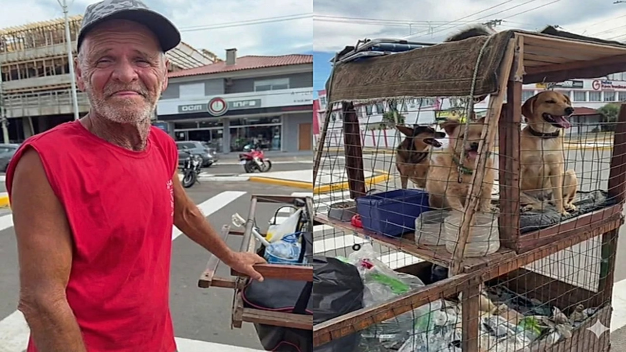 No litoral do Rio Grande do Sul, Paulo cria carrinho com sombra e água para três cães resgatados, protegendo-os do calor e reforçando cuidado e vínculo afetivo durante passeios urbanos.