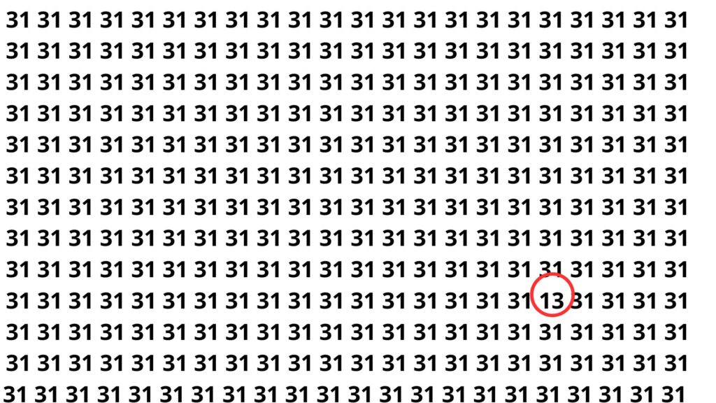 Se você ainda está tentando, respire fundo: o número escondido é 13. Ele se camufla perfeitamente entre os 31, explorando a semelhança visual e a tendência natural do cérebro de filtrar padrões repetidos. Por isso, apenas alguns conseguem achá-lo de primeira.