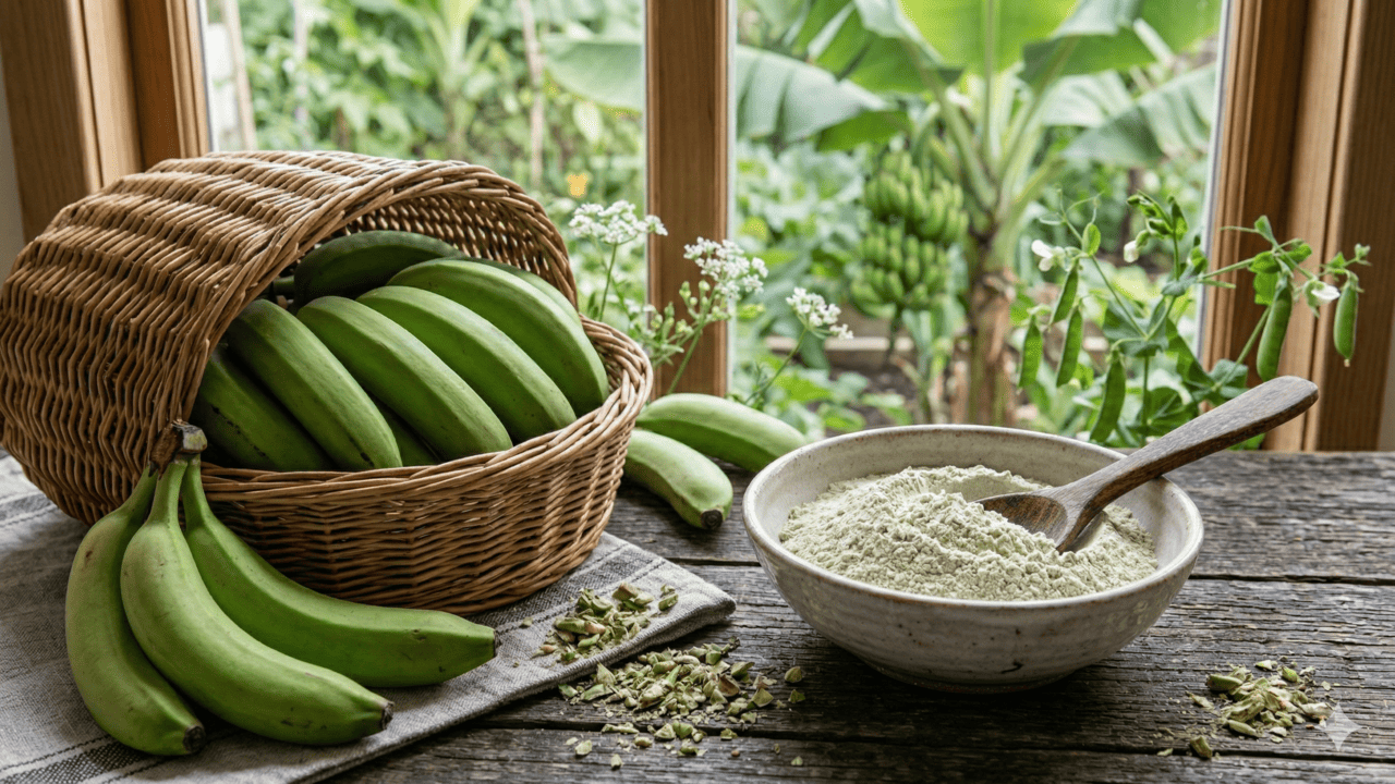 A farinha de banana verde é rica em amido resistente, ajuda a equilibrar a flora intestinal e pode melhorar o trânsito e a digestão.