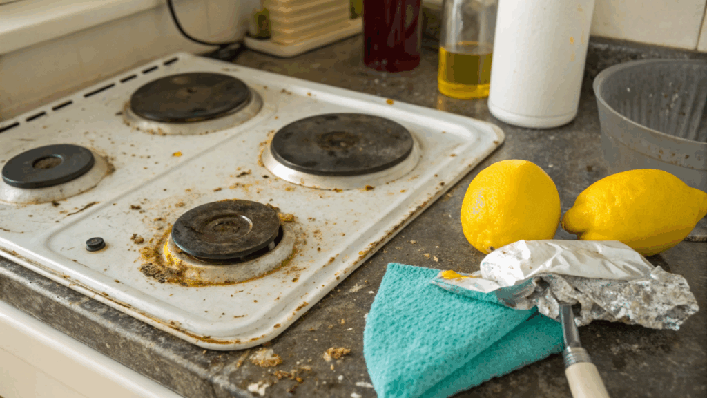 Qual é o truque para limpar fogão encardido com materiais descartáveis?