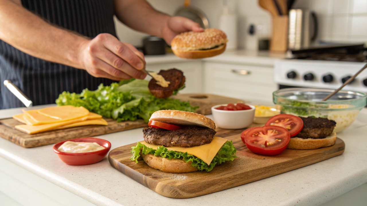 Depois de pronto, o hambúrguer caseiro pode ser montado de maneira clássica ou personalizada. A combinação com pão de brioche, queijo mussarela, alface e tomate segue como uma das mais populares por equilibrar maciez, gordura e frescor. A maionese, usada com moderação, complementa o conjunto sem dominar o sabor.