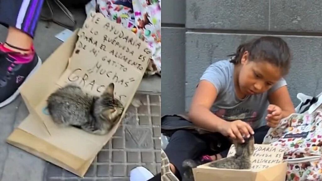 Uma menina foi vista pedindo comida não para si, mas para alimentar seu gato. A cena sensibilizou um homem que passava pelo local e decidiu agir.