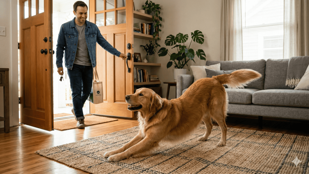 O espreguiçamento canino na chegada do tutor vai muito além do físico. O gesto é uma saudação repleta de afeto que demonstra confiança, bem-estar e reforça o vínculo emocional único entre o animal e seu humano favorito