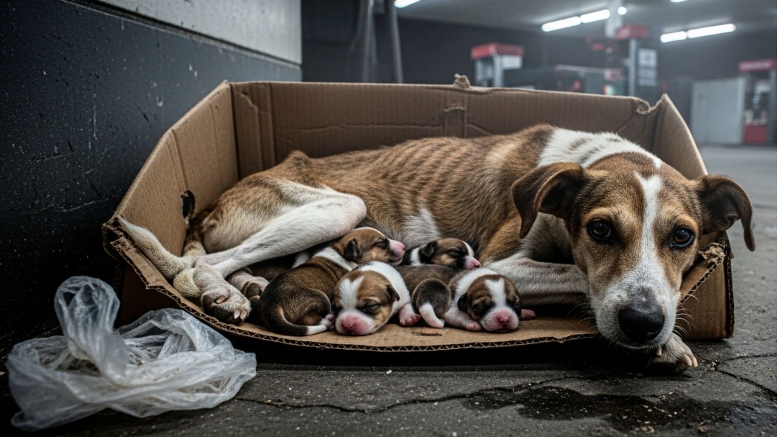 A cena era desoladora. Dentro de uma simples caixa de papelão, jogada como se fosse lixo, estavam Mila e seus nove filhotes. Todos apresentavam sinais claros de frio intenso e fome prolongada. A cadela estava visivelmente enfraquecida, tentando proteger os pequenos mesmo sem forças.