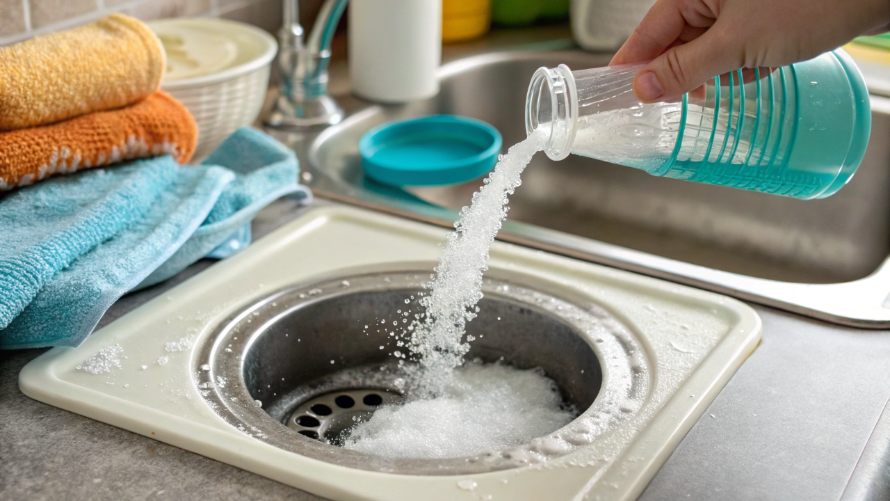 Misturar detergente com sal no ralo ajuda a soltar gordura e reduzir odores leves em poucos minutos.