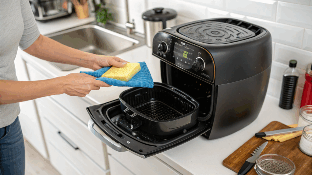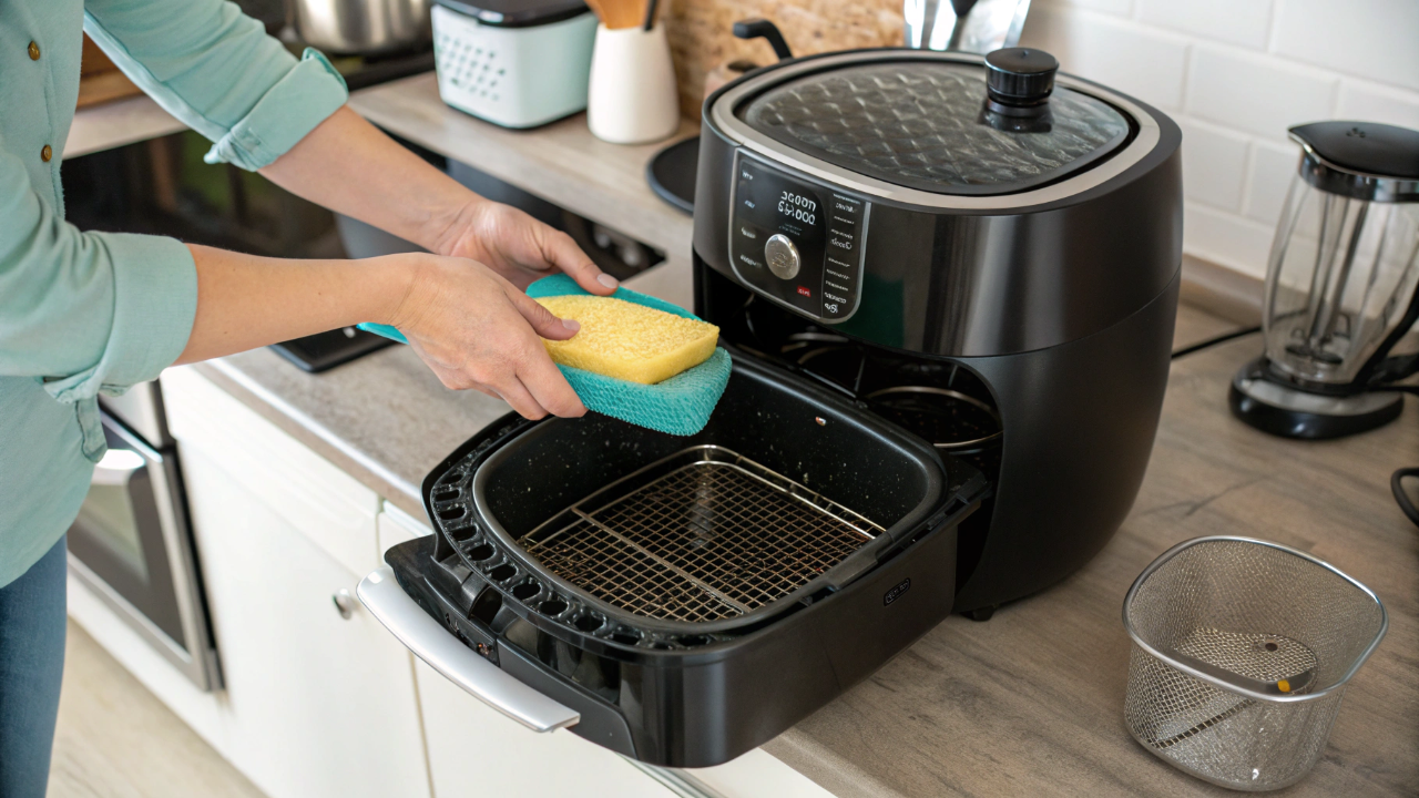 Manter a air fryer limpa em casa: passo a passo seguro com esponja, detergente e vinagre, evitando odores e prolongando a vida útil do aparelho.