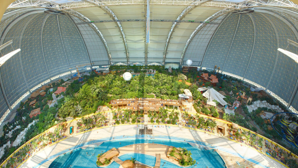 Do lado de fora, neve e floresta de pinheiros. Do lado de dentro, 26 °C constantes, praia de areia branca e 50 mil plantas tropicais. O Tropical Islands Resort, em Krausnick, a 60 km ao sul de Berlim, funciona dentro de um antigo hangar de dirigíveis que nunca chegou a abrigar uma única aeronave.