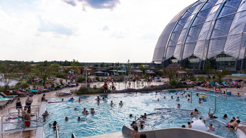 Brandemburgo, o estado onde fica o resort, registra temperaturas médias abaixo de zero entre dezembro e fevereiro. A paisagem ao redor do hangar é de planície arenosa, pinheiros cobertos de geada e lagos congelados. Visitantes chegam de casaco, gorro e luvas, atravessam as portas do Aerium e encontram areia sob os pés, vapor de água no ar e o som de cachoeiras. A diferença térmica entre o estacionamento e a beira da piscina pode ultrapassar 30 °C em um dia comum de janeiro.