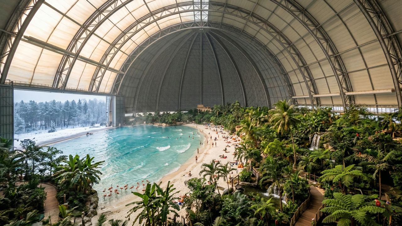 Você precisa cruzar a porta desse hangar no meio do inverno, sentir o ar quente bater no rosto e entender por que mais de um milhão de pessoas por ano trocam a neve alemã por uma praia que existe apenas porque alguém olhou para um galpão vazio e enxergou o oceano.