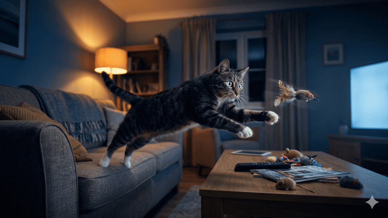 Uma forma simples de diminuir a bagunça na madrugada é reservar momentos de brincadeira intencional com o gato no fim da tarde e início da noite. Assim, ele gasta energia de forma saudável, se sente estimulado e chega ao horário de dormir mais calmo e com o corpo satisfeito.