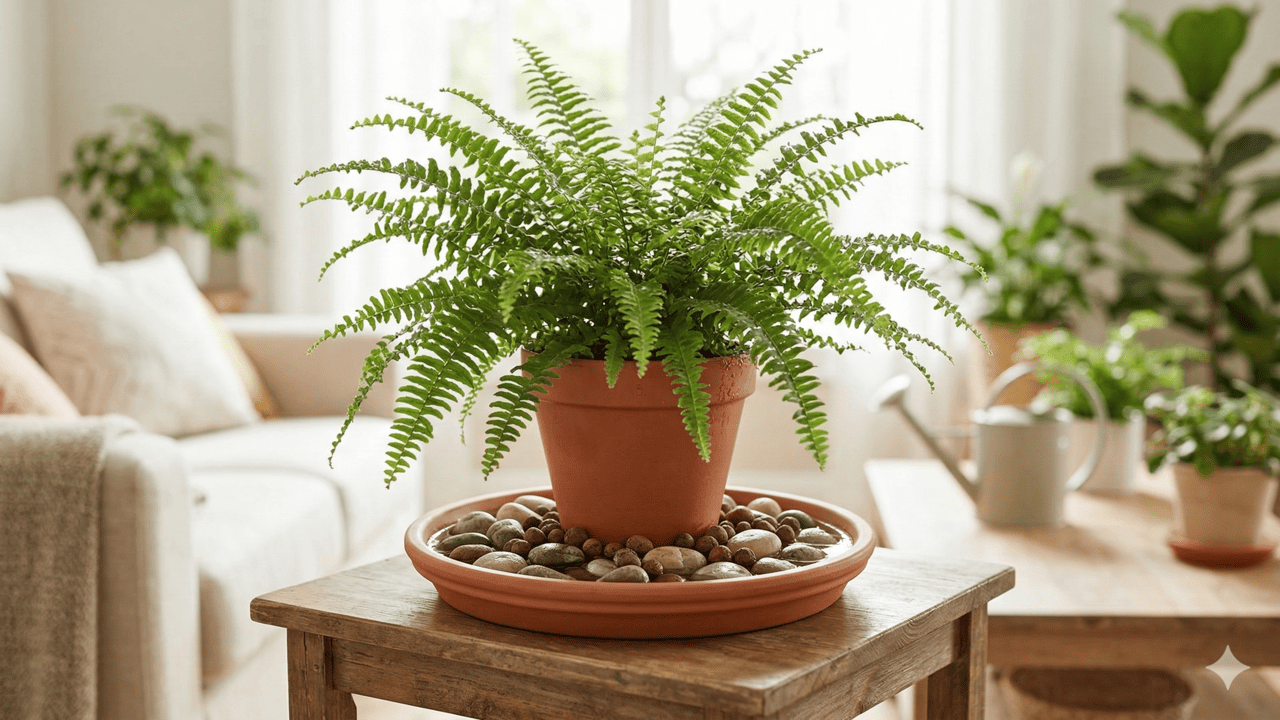 A samambaia sofre com o ar seco do verão. Aprenda a usar o truque do pratinho com pedras para criar umidade constante, evitando folhas secas e o apodrecimento das raízes por excesso de rega
