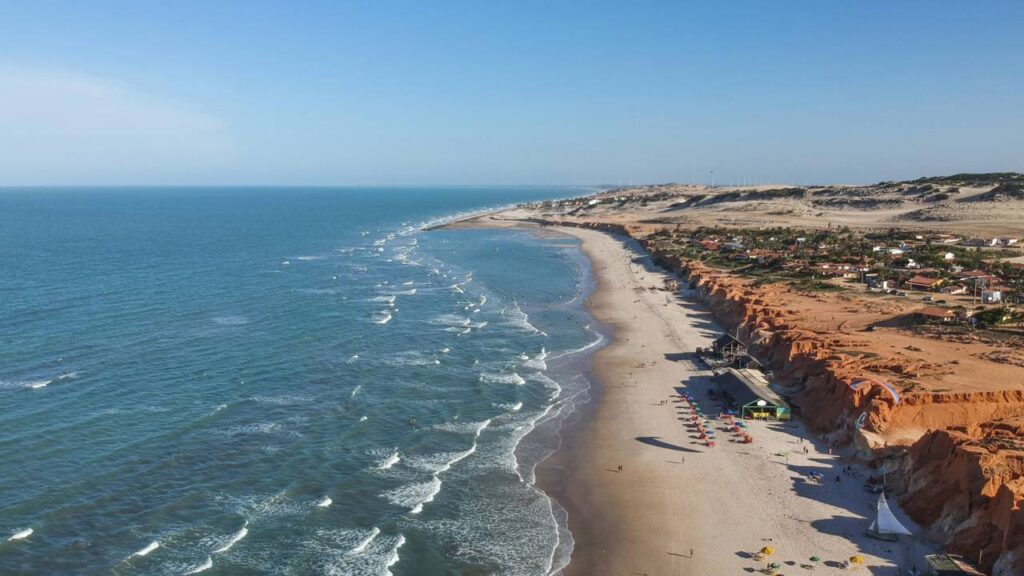 A 163 km de Fortaleza, paredões avermelhados encontram o mar esverdeado no litoral leste do Ceará. Canoa Quebrada nasceu como vila de pescadores e, desde os anos 1960, carrega um símbolo raro: uma lua e uma estrela talhadas diretamente nas falésias, marca registrada que nenhuma outra praia brasileira conseguiu imitar.