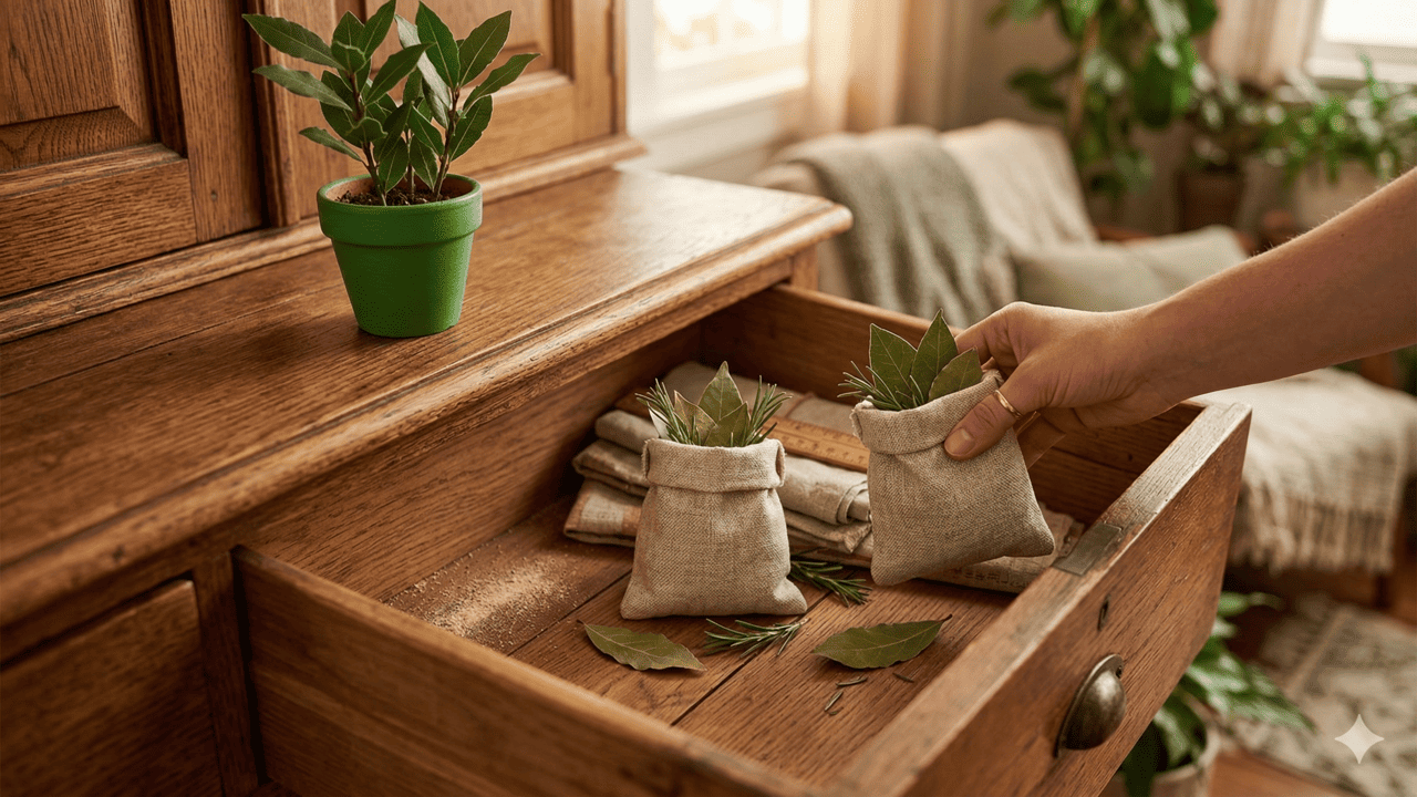 - Folhas secas em saquinhos: louro, alecrim ou eucalipto em saquinhos de tecido espalhados em gavetas e prateleiras.