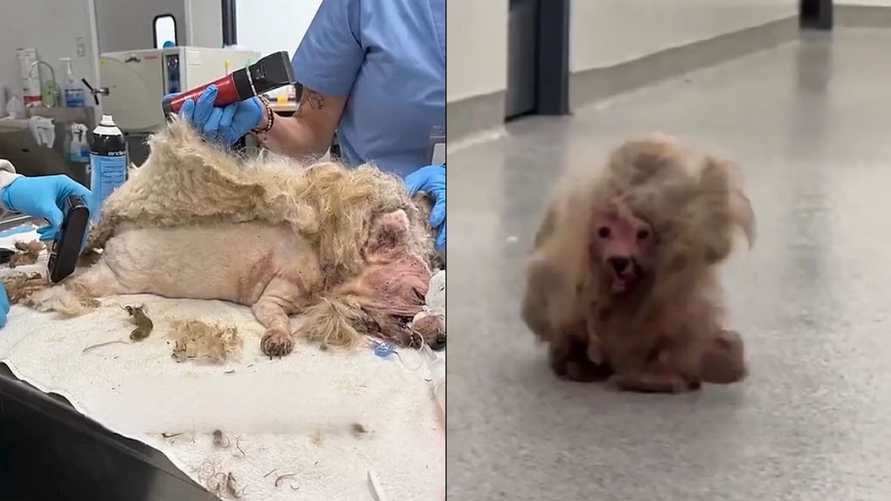 Antes do resgate, ela mal conseguia se mover. Os pelos crescidos, sujos e compactados formavam uma espécie de armadura pesada ao redor do corpo, limitando cada passo e causando dor e desconforto constantes. Quando foi encaminhada ao abrigo KC Pet Project, começou, enfim, uma jornada de recuperação e carinho.